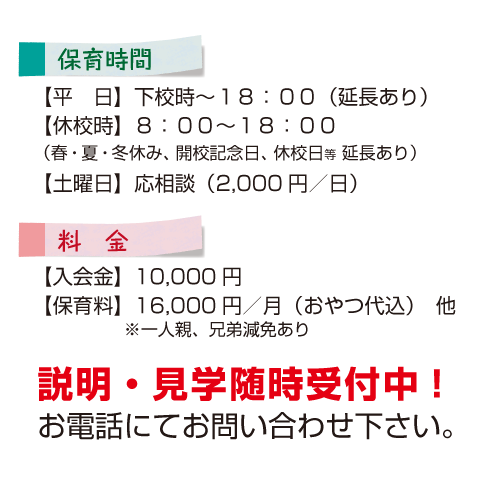 当クラブは放課後に帰宅しても保護者の就労等により、1人で留守番をさせることなどが心配な方々のために、子ども大好きな専門職の支援員を配置しています。